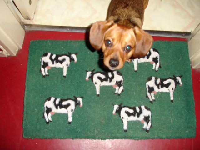 je n'ai pas pu m'empêcher de venir voir la tête du copain "ha la vache", il y en a plein sur le tapis... il a de la chance le chien d'avoir du lait à domicile.