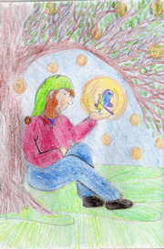 Pendant qu’elle me parlait, Cléia s’était confortablement installée sur une branche à hauteur de mon visage. Elle tenait en équilibre sur cette fragile branche, assise en tailleur, son petit panier posé à côté d’elle. Quant à moi, adossé à un arbre, je l’écoutais, émerveillé.